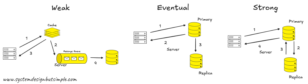 Weak Consistency – No guarantees that a read will return the latest write. It's fast and available but may return stale data. Useful for VoIP, video chat, and realtime multiplayer games.