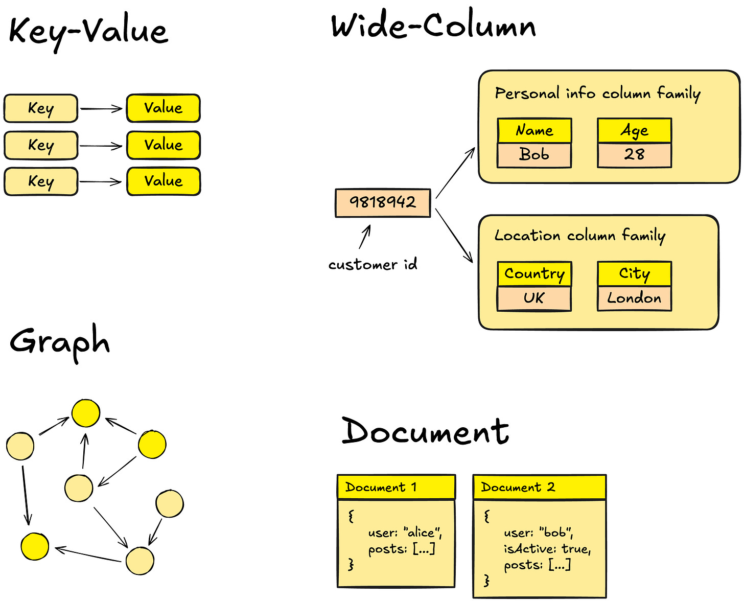 NoSQL: Flexible data storage (documents, key-value, graph, wide-column). No fixed schema required.