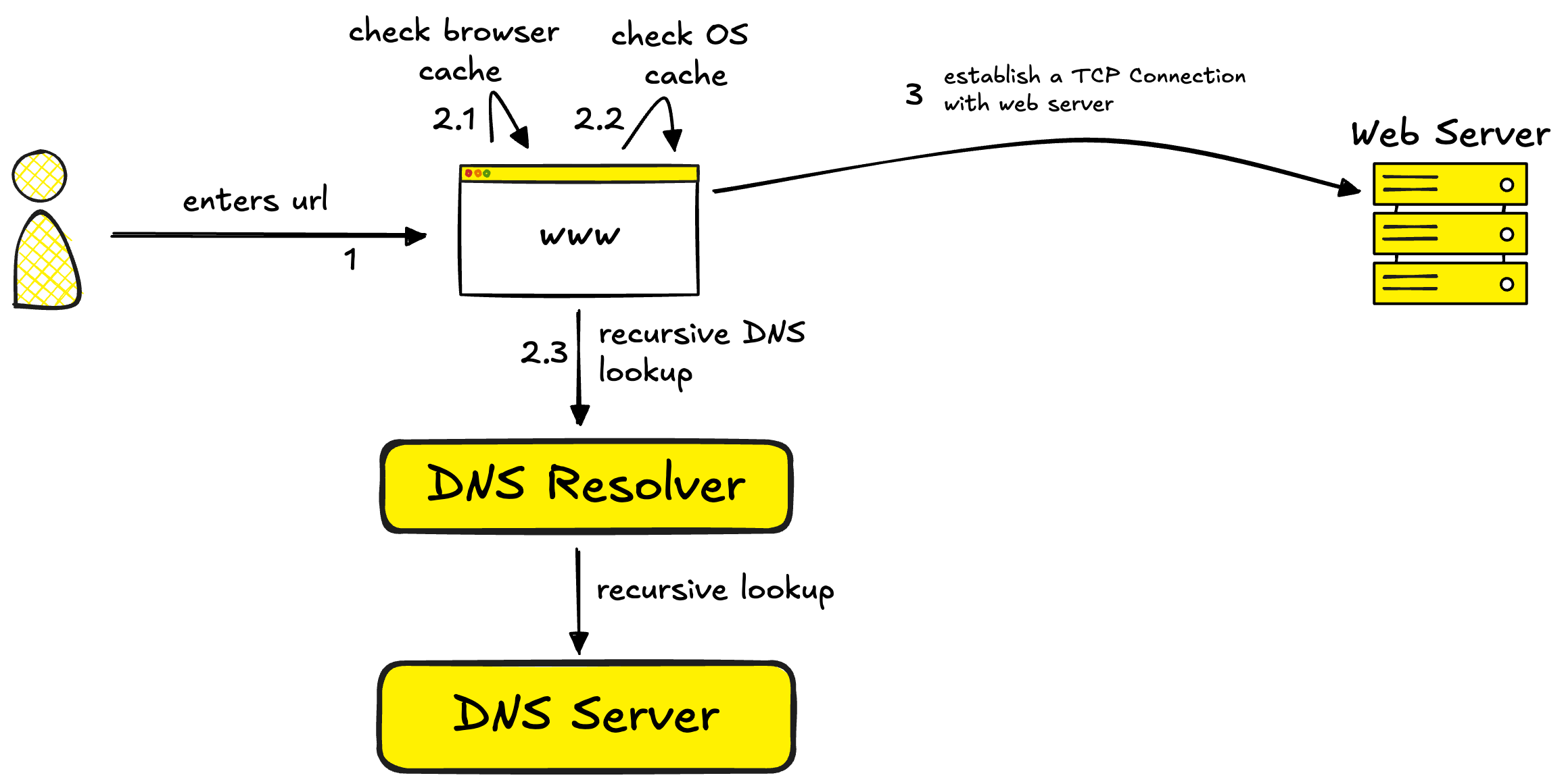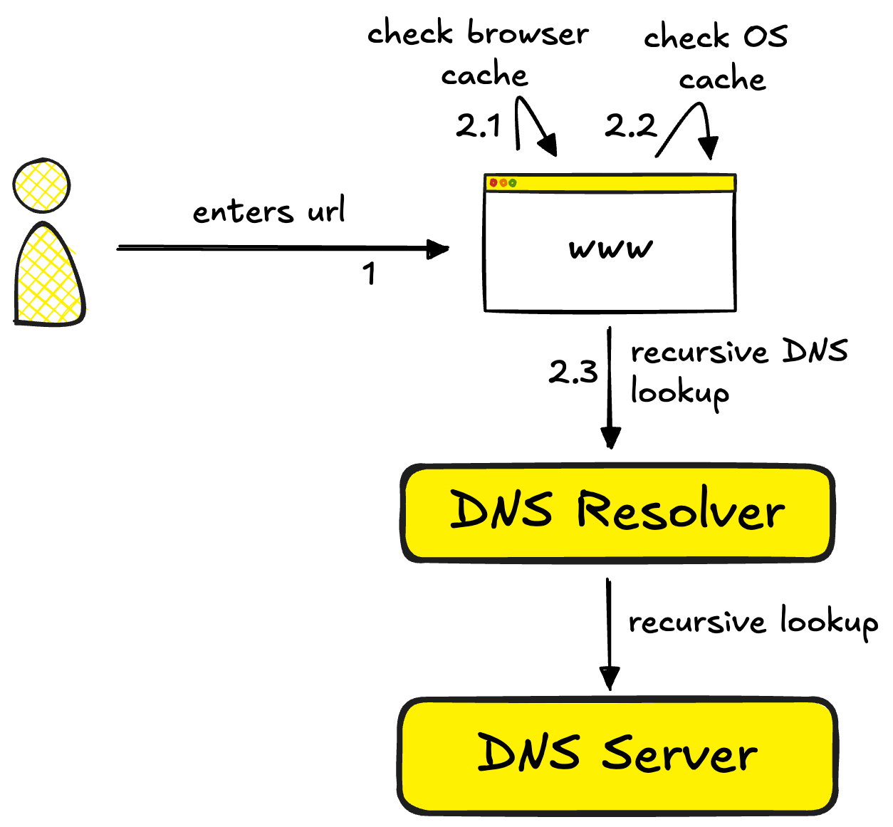 If neither has the answer, the OS queries a DNS resolver (usually provided by your ISP). This kicks off a chain of requests through the DNS infrastructure, from root servers to authoritative name servers, until the IP address is found.